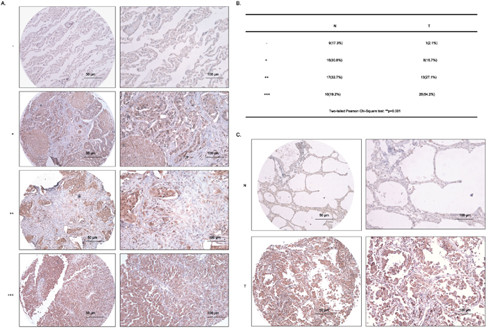 Figure 8: RAD51 is highly upregulated in lung adenocarcinoma tissues. A. The criteria for the judgement of IHC results from tissue microarray (TMA). B. The two-tailed Pearson Chi-Square test of data from IHC assays. N, normal, T, tumor. C. Representative data of IHC results from TMA. Scale bars, 50 μm and 100 μm.