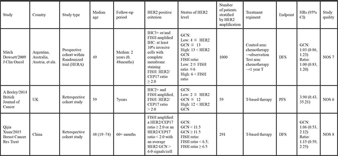 The main characteristics of the included studies are displayed in Table 2 [66–68]. The studies were conducted all over the world, including Europe, America, Asia, and Africa. Two were retrospective cohort studies and the other was a prospective cohort within a large international randomized clinical trial. The trastuzumab-based therapy applied in different studies was single trastuzumab therapy or in combination with traditional chemotherapy (mainly paclitaxel). All the studies adopted the immunohistochemistry (IHC) or FISH method to assess the HER2 status. The number of patients stratified by HER2/CEP17 ratio or (and) HER2 GCN ranged from 59 to 1000. The follow-up period was long enough for the outcomes to occur. All the studies used DFS as the end point. The HER2 amplification was divided into high and low levels according to the original article and corresponding HRs for high to low HER2 amplification level are shown in Table 2. None of these three studies gained a Newcastle-Ottawa Quality Assessment Scale (NOS) < 6, suggesting that all of them have high level of methodological quality in this meta-analysis.
