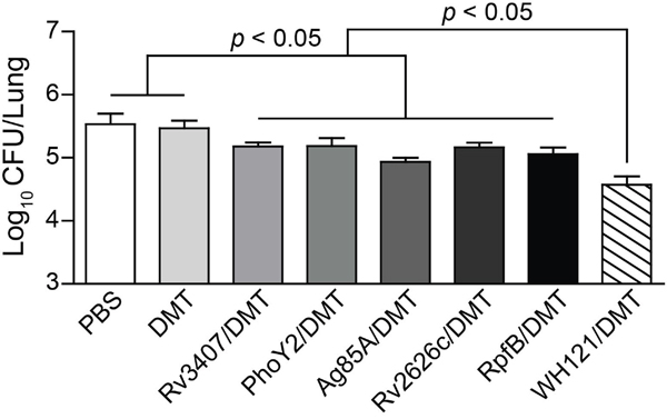 Moreover, the protection conferred by DMT adjuvanted WH121 or single multistage antigen was evaluated in vaccinated C57BL/6 mice by challenged intranasally (i.n.) with approximately 80 CFU of M. tuberculosis at six weeks after immunization. Four weeks later, the bacterial load in the lung was compared between different groups. Of all groups, PBS control mice had the highest bacterial load of M. tuberculosis in the lung of the infected mice (p < 0.05, Figure 3). Most importantly, vaccinating with WH121/DMT more significantly inhibited the growth of M. tuberculosis in the lung of infected C57BL/6 mice than both PBS control and each multistage antigen groups, although mice vaccinated with single multistage antigen also had a lower lung bacterial load than PBS control (p < 0.05).