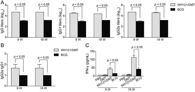 Furthermore, the WH121-specific Th1-type cytokine IFN-γ secreted by splenocytes from different groups were also compared (Figure 4C). Of all groups, the lowest level of WH121-specific IFN-γ was secreted by splenocytes from PBS control mice as expected at 9 and 18 weeks after immunization (p < 0.05). Although the levels of WH121-specific IFN-γ were increased over time (p < 0.05) in both groups, WH121/DMT induced a higher level of IFN-γ response to WH121 than the BCG vaccine (p < 0.001).