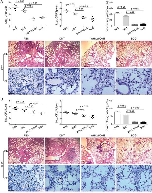 Figure 6: Protective efficacy of WH121/DMT vaccinated mice against primary infection. C57BL/6 mice were vaccinated with WH121/DMT, BCG, DMT, or PBS. 9 A. or 18 B. weeks later, vaccinated C57BL/6 mice were challenged i.n. with 80 CFU of the M. tuberculosis H37Rv. Four weeks post-challenge, their lungs and spleens were harvested, and the CFU numbers per organ were counted. The results are shown as the mean of log10 CFU ± SEM per organ for each group (n=6) and the lung pathological scores of different vaccinated mice. The left lung lobes from different vaccinated mice were fixed and embedded for HE staining (scar bar, 400 μm) and acid-fast (AF) staining (scar bar, 50 μm). Arrows indicate AF-positive bacteria.