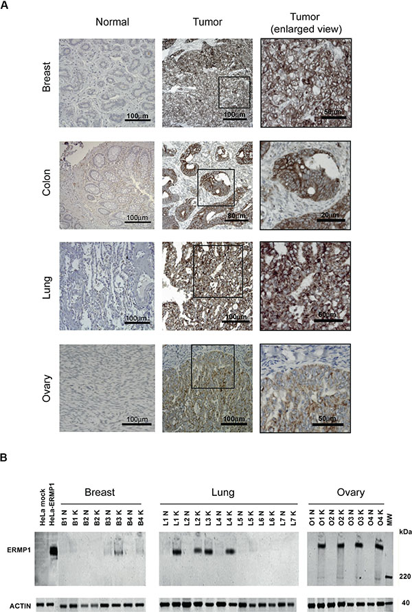 Figure 1: ERMP1 is over-expressed in breast, lung, colon and ovary cancers. (A) Immunostaining of cancerous and normal samples with the anti-ERMP1 mAb. (B) Immunoblot analysis of clinical samples. Total protein extracts (25 μg) from cryo-preserved breast, lung and ovary biopsies of cancer (K) and normal (N) tissues from patients were separated by SDS-PAGE and subjected to Western blot with anti-ERMP1 or anti-actin mAbs. Total extracts from HeLa cells transfected with ERMP1 coding plasmid and mock-transfected (empty plasmid) cells were analyzed in parallel as controls. Molecular weight markers (MW) are on the right.