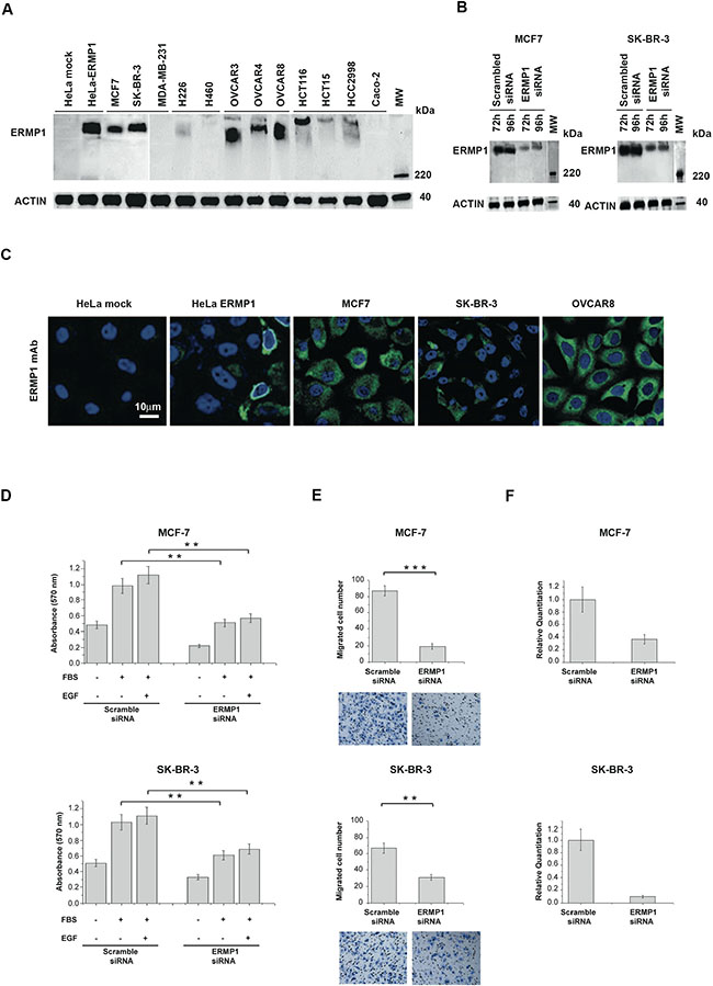 Figure 2: ERMP1 is expressed in human cancer cell lines and is involved in cell proliferation and invasiveness. (A) ERMP1 expression in cancer cells lines. Total extracts of the indicated cancer cell lines were separated on SDS-PAGE (25 μg/lane, corresponding to approximately 0.5 × 106 cells) and subjected to Western blot using the anti-ERMP1 mAb. Total extracts from HeLa cells transfected with ERMP1 coding plasmid and mock-transfected (empty plasmid) cells were analyzed in parallel as controls. Images derive from distinct immunoblots. (B) ERMP1 knockdown by siRNA. MCF7 and SK-BR-3 cells were transfected with 1nM of ERMP1-specific siRNAs or scramble controls. After 72 and 96 hours, total protein extracts were separated by SDS-PAGE, blotted on nitrocellulose membranes and subjected to Western blot using the anti-ERMP1 mAb, and an anti-actin antibody as internal control. (C) ERMP1 localization in cancer cells lines. Confocal microscopy analysis of cells fixed, permeabilized and incubated with the anti-ERMP1 mAb. HeLa cells transfected with ERMP1 coding plasmid and mock control cells were analyzed in parallel. Cells were stained with Alexafluor 488-labeled goat anti-mouse antibodies to detect ERMP1 (green) and DAPI to visualize nuclei (blue). (D) Cell proliferation. MCF7 and SK-BR-3 cells were transfected with ERMP1-specific or scrambled siRNA. After 48 hours cells (2 × 104 /well) were plated in 96 well plates and incubated for additional 24 hours in medium containing 2.5% FBS, with or without 10ng/ml EGF or in stimuli-free medium. Thereafter proliferation was assessed by the MTT assay. (E) Cell invasiveness. MCF7 and SK-BR-3 cells transfected with ERMP1-specific siRNA or scrambled siRNA were loaded of matrigel-coated 96-well plates and analyzed by the Boyden invasion assay. Cells migrated towards the lower surface of the chamber filters were fixed and counted after Diff-Quick staining. Images of the visual counting of each sample are reported below the graphs. Asterisks mark samples showing a significant difference (**p < 0.05; ***p < 0.01). (F) Reduction of ERMP1 transcript level in MCF7 and SK-BR-3 cells upon gene silencing. q-RT-PCR was performed using MAPK gene as housekeeping control. Data from phenotypic assays represent the means of three replicated experiments, run in triplicate.