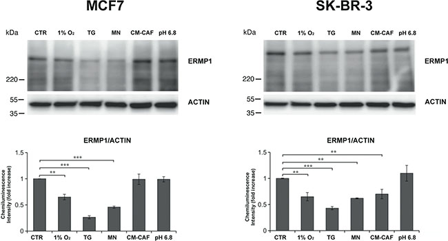 Figure 3: ERMP1 expression is modulated by tumor microenvironment stimuli. Western blot analysis of ERMP1 expression in response to oxygen availability, pH and oxidative stresses. MCF7 (left) and SK-BR-3 cells (right) were cultured for 24 h under hypoxia (1% O2), 0.5 μM thapsigargin (TG), 3 μM (MN) menadione, acidic medium (pH 6.8), or with conditioned media (CM) from cancer-associated fibroblasts (CAFs). Total cells extracts were separated by SDS-PAGE (25 μg/lane) and analyzed by Western blot with the anti-ERMP1 and actin-antibodies. Graphs below the immunoblots represent a relative quantification of ERMP1, expressed as chemiluminescence intensity ratio of ERMP1 vs actin bands. Data represent the meanvalues of four replicated experiments (**p < 0.05 and ***p < 0.01).