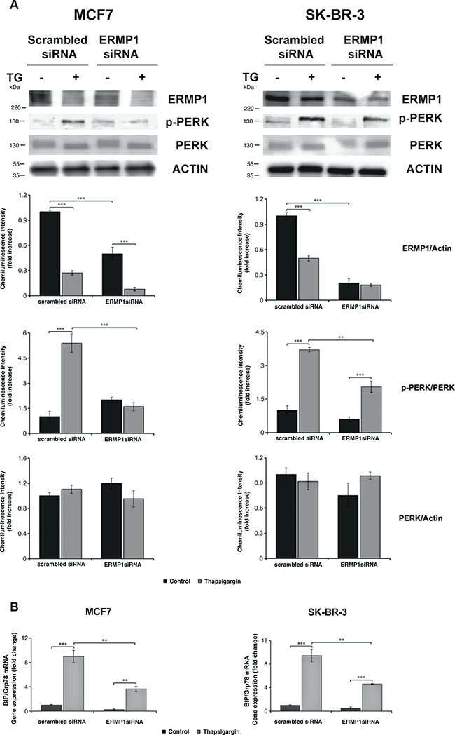 Figure 4: ERMP1 controls the ER stress-induced activation of PERK and GRP78/BiP. (A) Western blot analysis of PERK phosphorylation in response to ERMP1 silencing and thapsigargin stress. MCF7 and SK-BR-3 cells knocked down for ERMP1 gene or non-silenced (scrambled siRNA) were treated with 0.5 μM thapsigargin (TG) for 24 hours in starvation medium, lysed, and cell lysate were separated by PAGE-SDS and used for Western Blot analysis. The membranes were treated with anti-ERMP1, anti-p-PERK, anti-PERK and anti-actin antibodies. (B) q-RT-PCR analysis of GRP78/BiP transcription in MCF7 and SK-BR-3 cells subsequent to ERMP1-silencing and/or exposition to thapsigargin stress. Total RNA was isolated from the MCF7 and SK-BR-3 the same cell samples and GRP78/BiP transcription was analyzed by q-RT-PCR, using β2-microglobulin as reference gene for sample normalization. Data are expressed as means ± S.D. calculated on an average of four independent experiments (**p < 0.05 and ***p < 0.01).