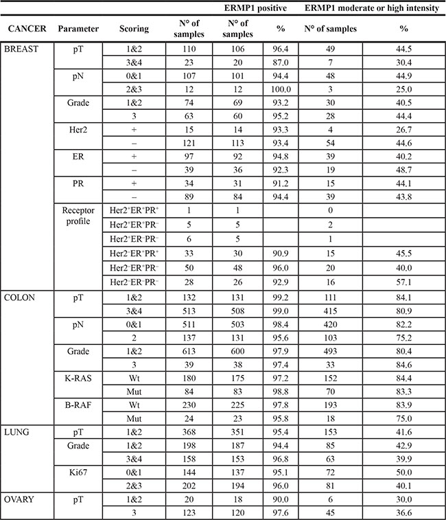 In NSCLC cancer, ERMP1 was detected in 95.4% of the cases, 41.4% of which showed a strong or moderate staining. Also in this cancer type, no association was found between protein expression levels and pathological features including grading and proliferation index as assessed by Ki67 immunostaining (Table 1).