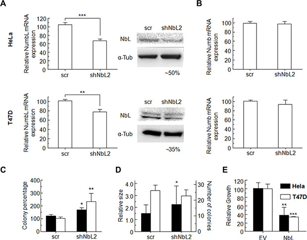 Figure 1: (A) Transfection of HeLa or T47D cells with NumbL-shRNA plasmids induce a decrease in NumbL expression, detected both by RT-qPCR and WB assays. (B) This shRNA has no effect on Numb expression as determined by RT-qPCR assays. (C) Clonogenicity assays for HeLa and T47D pBABE cells transfected with scrambled or shNbL shRNA2, (D) soft agar, (E) growth clonability by overexpression of NumbL cDNA. All experiments were repeated a minimum of three independent times in triplicate. All figures include Student’s t-test for statistical analysis of the data. * = p < 0.05; ** = p < 0.01; *** = p < 0.001.