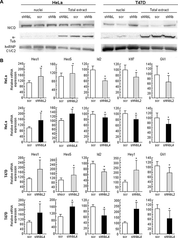 Figure 2: NumbL downregulation activates Notch signaling. (A) NICD localization in nuclei and total extracts in HeLa and T47D cells. (B) Expression of Notch pathway-related genes. Two different shRNAs (shNbL2 and shNbL4) were used to eliminate possible off-target effects. The sequence of both shRNAs is shown in M&M. All experiments were repeated a minimum of three independent times in triplicate. All figures include Student’s T test for statistical analysis of the data. * = p < 0.05; ** = p < 0.01; *** = p < 0.001.