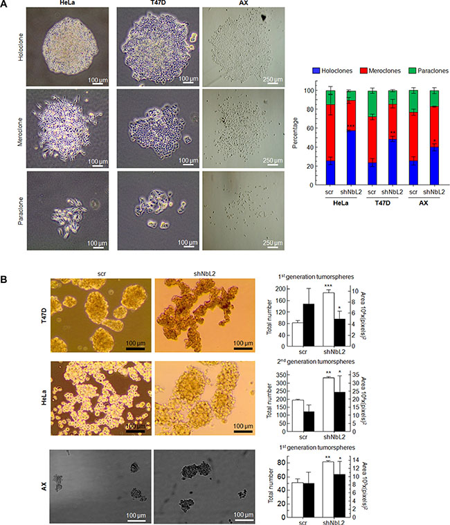 To this end, we cultured cells at low density to form independent colonies from individual clones. These clones have been previously classified as holoclones, meroclones and paraclones based on their ability to reconstitute a tumor from a single cell [50, 51]. Basically, holoclones are considered to be derived from stem cells, while paraclones are differentiated cells that are incapable of reconstituting a culture (Figure 4A). Meroclones are intermediate phenotypes between holo- and paraclones. The percentage of holoclones in shNbL cells was increased from 30% to 60% in HeLa cells, while in T47D this increment was from 30% to 50% (Figure 4A).