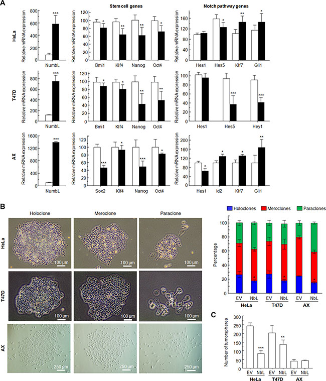 Figure 5: Overexpression of NumbL cDNA in HeLa, T47D and AX cells. (A) Overexpression of NumbL cDNA downregulates stem- and Notch-pathway related genes. (B) Type and percentage of each of the different clones observed for HeLa, T47D and AX cells upon overexpression of NumbL cDNA. Figure shows typical colonies (left) and the percentage of each type in all cases (right). (C) Tumorsphere assay for HeLa cells (2nd generation), T47D cells (1st generation), and AX low passaged sarcoma cells (1st generation) showing total number of tumorspheres. All experiments were repeated a minimum of three independent times in triplicate. All figures include Student’s T test for statistical analysis of the data. * = p < 0.05; ** = p < 0.01; *** = p < 0.001.