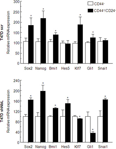 Figure 6: T47D control cells or T47D cells expressing the shNbl2 were selected for CD44+/CD24− (solid black bars) or CD44- (open bars) subpopulations. Transcriptional analysis of stem- or Notch-related genes was performed by qRT-PCR. All experiments were repeated a minimum of three independent times in triplicate. All figures include Student’s T test for statistical analysis of the data. * = p < 0.05; ** = p < 0.01; *** = p < 0.001.