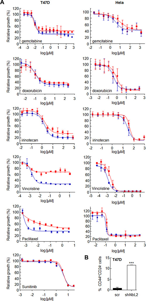Figure 7: (A) NumbL downregulation induces resistance to different chemotherapeutic drugs. Hela and T47D cells carrying scrambled (blue circles) or NumbL shRNA2 (red squares) were treated with 11 different doses of the indicated drug for 96 hrs. A minimum of three independent experiments in triplicate were performed to obtain the average values (Table 1). The figure shows one representative experiment. Bars indicate SD of the triplicate samples. (B) T47D cells were treated with vincristine and were subjected to flow cytometry analysis to detect the population of CD44+/CD24− cells. The percentage of CD44+/CD24− cells is shown. All experiments were repeated a minimum of three independent times in triplicate. All figures include Student’s T test for statistical analysis of the data. * = p < 0.05; ** = p < 0.01; *** = p < 0.001.