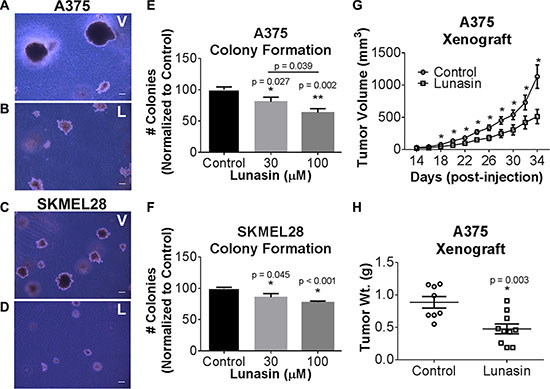 Figure 1: In vitro efficacy of lunasin in malignant melanomas. Representative images of colonies grown in soft agar for vehicle-treated (A, C) and Lunasin-treated (B, D) A375 (top panels) and SKMEL-28 (bottom panels) cells (magnification at 40×). Scale bars on images represent 100 μm. Anchorage-independent growth conditions sensitized melanoma cells to Lunasin resulting in a significant decrease in colony formation in A375 (E) and SKMEL-28 (F) cells. Statistical significance between treatment groups is denoted by a different number of asterisks (*, **) and p-values are provided for each significant difference. Error bars on graphs represent mean ± S.D. For xenograft studies (2.5 × 106 A375 cells were injected s.c. into nude mice and subsequently treated with vehicle (n = 8) or Lunasin (n = 10) for a total of 34 d. Lunasin reduced tumor volume by 55% (G) and wet tumor weight by 46% (H). Lunasin-treated mice differed significantly in tumor volume (p < 0.001) from control treated mice. The corresponding reduction in wet tumor weights were determined to be significant by unpaired student’s t-test (p = 0.003) and denoted by an asterisk (*). Error bars represent mean ± S.E.M.