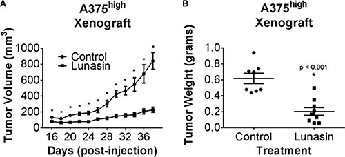 Figure 4: Lunasin inhibited CIC tumorigenesis in vivo. Athymic nude mice were injected s.c. with 1 × 104 A375 ALDHhigh cells and subsequently dosed with either 30 mg/kg of Lunasin or vehicle every day for 38 d. Upon endpoint, average tumor volumes in Lunasin (n = 9) treated mice were significantly lower compared to mean tumor volume in vehicle (n = 8) treated mice (A). Upon resection of tumor tissues, wet tumor weights were determined and found to be reduced in Lunasin-treated mice (B). Statistical significance between mean tumor volumes of control and treatment groups was determined using GraphPad ANOVA analysis tool (p < 0.05). Statistically significant differences in tumor volumes and wet tumor weights were determined by student’s t-tests, and are denoted by an asterisk (*). Error bars represent mean ± S.E.M.