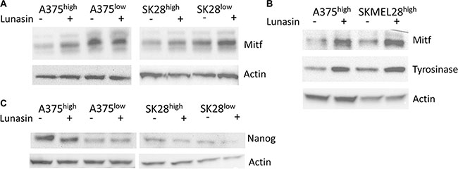 Figure 6: Lunasin modulated expression of melanocyte differentiation and stem-cell-associated markers. Sorted subpopulations of ALDHlow and ALDHhigh cells displayed differential expression of the melanocyte-associated transcription factor MITF, with ALDHlow cells expressing higher levels of MITF than ALDHhigh populations in both A375 and SKMEL-28 cell lines (A). MITF and the downstream melanocyte differentiation marker Tyrosinase were strongly induced in ALDHhigh cells treated with Lunasin for 24 h (B). Immunoblot analysis revealed that NANOG, a stem-cell-associated marker, was significantly repressed in Lunasin-treated ALDHhigh samples (C). Actin was used as a reference.
