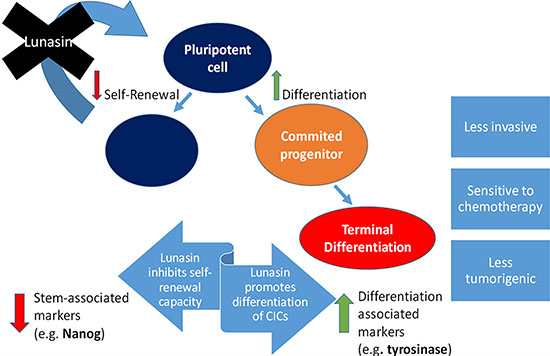 Figure 7: Proposed mechanism for Lunasin’s activity in melanoma CICs. This diagram depicts the observed effects and possible therapeutic advantage of Lunasin treatment in cases of malignant melanoma. Lunasin decreased the stem-cell-like properties of ALDHhigh CICs isolated from A375 and SKMEL-28 cell lines while concurrently decreasing the stem-cell-associated marker NANOG and inducing expression of melanocyte differentiation markers MITF and Tyrosinase. By effectively reducing this stem-cell-like compartment, Lunasin may alleviate patient relapse caused by the subpopulation of cells with intrinsic metastatic potential and chemoresistance.