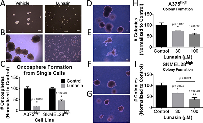 CICs are characterized by having stem-cell-like properties, including the ability to self-renew. Oncosphere formation assays have been widely used to measure the functional activity of CICs, and previous studies have indicated that the ALDHhigh melanoma cells represent the CIC-enriched compartment [13]. To determine the effects of Lunasin on melanoma CIC functional properties, we performed clonogenic and sphere formation assays with isolated ALDHhigh A375 and SKMEL-28 melanoma cells. We first established stringent assay conditions in which spheres (floating) and colonies (formed in soft agar) are all of clonal origin. Under these conditions, treatment with 100 μM Lunasin significantly inhibited sphere establishment in ALDHhigh A375 melanoma cells and in ALDHhigh SKMEL-28 melanoma cells (Figure 3A–3C). Similarly, Lunasin-treatment at both 30 μM and 100 μM drug doses significantly affected colony forming ability in isolated ALDHhigh A375 melanoma cells (Figure 3D, 3E, and 3H) as well as in ALDHhigh SKMEL-28 cells (Figure 3F, 3G, and 3I). In addition to reducing the number of colonies formed, Lunasin also caused a significant reduction in the size of the colonies that did form (Figure 3D–3G). Collectively, these results indicate that treatment with Lunasin negatively regulates melanoma CIC functional properties in vitro. In these assays, we demonstrated Lunasin functionally represses the clonogenic ability of melanoma CICs by inhibiting their potential to form oncospheres in non-adherent conditions as well as self-renewal capacity when suspended in soft agar.