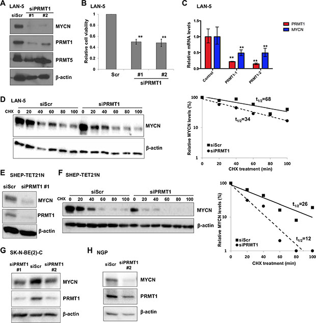 Figure 3: PRMT1 regulates MYCN expression. (A) Western blot analysis of PRMT1 knockdown in LAN-5 cells 6 days following transfection with two independent PRMT1 siRNAs with indicated antibodies. β-actin was used as a loading control. (B) PRMT1 knockdown reduces cell viability. Cell viability was measured using the Trypan blue viability test and results are expressed as percentage of viable cells. Mean ± SEM (n = 3, Student’s t test, **P < 0.01). (C) RT-qPCR analysis of PRMT1 and MYCN mRNA levels in siPRMT1-transfectd LAN-5 cells. Mean ± SEM (n = 3, Student’s t test, **P < 0.01). (D) Immunoblots with anti-MYCN and β-actin (loading control) after CHX treatment following transient transfection of scrambled siRNA (siScr) or siPRMT1#1 in LAN-5 cells. Plots of densitometric quantification of MYCN protein stability were shown. (E) Western blot analysis of PRMT1 knockdown in SHEP-TET21N cells (Tet-off, MYCN on) 6 days following transfection with siPRMT1 #1 with indicated antibodies. β-actin was used as a loading control. (F) Immunoblots with anti-MYCN and β-actin after CHX treatment following transient transfection of scrambled siRNA (siScr) or siPRMT1#1 in SHEP-TET21N cells (Tet-off, MYCN on). Plots of densitometric quantification of MYCN protein stability were shown. Western blot analysis of PRMT1 knockdown in SK-N-BE(2)-C (G) and NGP cells (H) 6 days following transfection with PRMT1 siRNAs.