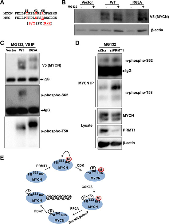 Figure 5: Cross-talk between R65 methylation and pT58 and pS62. (A) Alignment of MYCN (53-71) and corresponding MYC protein sequences. The consensus substrate sequence of CDK is also shown. (B) Western blot analysis of stably transfected HEK293 cells with V5-tagged MYCN wildtype or R65A in the presence of absence of MG132 treatment (6 hr). β-actin was used as a loading control. (C) V5-tagged MYCN was immunoprecipitated with anti-V5 antibody from (B) after MG132 treatment, followed by western blot with indicated antibodies. The IgG heavy-chain was also indicated. (D) MYCN was immunoprecipitated with anti-MYCN antibody from SHEP-TET21N cells (Tet-off, MYCN on) 3 days post-transfection with siPRMT1#1 and 6 hr of MG132 treatment, followed by western blot with indicated antibodies. Western blot analysis of whole cell lysates was also shown. β-actin was used as a loading control. (E) The life cycle of MYCN from synthesis to degradation is shown. PRMT1-mediated R65 methylation may prime MYCN for phosphorylation at S62 via CDK, stabilizing MYCN and further priming it for phosphorylation at T58 through GSK3β. Dephosphorylation of pS62 via protein phosphatase 2A (PP2A) sensitizes MYCN phosphorylated at T58 to bind to E3 ligase, such as F-box and WD repeat domain-containing 7 (Fbw7), for subsequent ubiquitination and degradation. Demethylation of R65 may occur through unknown demethylases.