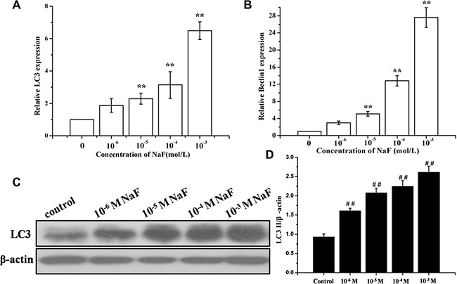 RT-PCR and western blotting analysis of LC3 were performed to detect autophagy in cells treated with 10– 6, 10–5, 10–4 and 10–3 mol/L NaF for 24 h. Figure 2A and 2C showed that NaF significantly increased the expression of LC3 mRNA and proteins levels in osteoblasts. Meanwhile, the mRNA expression levels of Beclin 1 had accordant trend with LC3 (Figure 2B). These observations show that NaF induces autophagy of MC3T3-E1 cells in a dose-dependent manner.