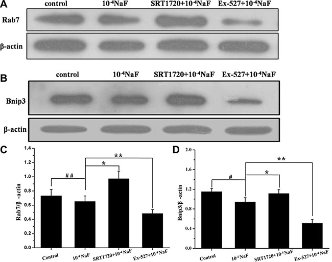 Figure 11: The pathways mediated by SIRT1 in NaF-induced apoptosis and autophagy. The protein expression levels of Rab7 and Binp3 were detected to evaluate SIRT1-mediated pathways in cells treated with NaF alone, pre-incubated with SRT1720 or pre-incubated with Ex-527. (A, B) The Rab7 and Binp3 expression levels were detected using Western blot assay. (C, D) Results of densitometric analysis for Western blot.