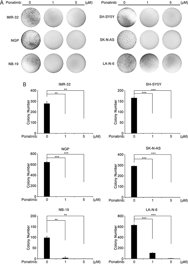 Anchorage-independent growth in soft agar is one of the unique characteristics of tumor cells. Thus, to evaluate whether ponatinib could inhibit the colony-formation ability of NB cells, soft agar assays were performed using a panel of six NB cell lines. As shown in Figure 2A and Figure 2B, both the images and the colony counting results confirmed that ponatinib inhibited the anchorage-independent colony formation of all tested NB cells.