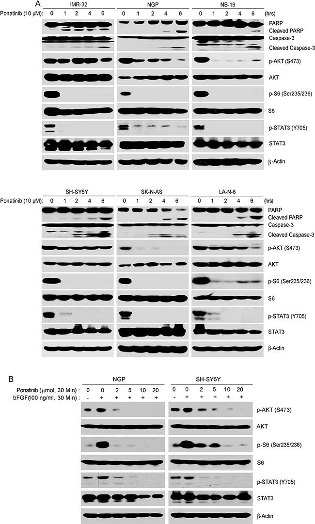 Figure 3: A. Ponatinib inhibits PI3K/AKT/mTOR and JAK/STAT3 signaling pathways, and induces cell death in NB cells. NGP, NB-19, SH-SY5Y, SK-N-AS and LA-N-6 cells were treated with 10 μM of ponatinib for various time points (0-6 hrs), subjected to SDS-PAGE, and then immunoblotted with PARP, p-AKT (S473), AKT, p-S6 (Ser235/236), S6, p-STAT3 (Y705), STAT3, Caspase-3, and β-Actin antibodies. B. Ponatinib inhibits the phosphorylation of the downstream effectors of FGFR1 after bFGF stimulation: NGP and SH-SY5Y cells were treated with different concentrations of ponatinib with or without 100 ng/ml bFGF after starvation for 16 hrs. Cells were harvested and subjected to SDS-PAGE, and then immunoblotted with the indicated antibodies.