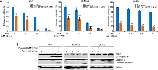 Figure 4: Ponatinib enhances the cytotoxic effect of Dox on NB cell lines. A. NGP, SK-N-AS, and LA-N-6 cells were seeded in 96-well plates and were incubated with the indicated concentrations of Dox plus DMSO or 1 μM of ponatinib for 48 hrs. Cell viability was then measured by CCK-8 assay. B. NGP, SK-N-AS, and LA-N-6 cells were treated with either Dox (1 μM) alone, ponatinib (1 μM) alone, or their combination for 0-16 hrs, subjected to SDS-PAGE, and immunoblotted with PARP and Caspase-3 antibodies. β-Actin antibodies were used as a loading control for whole cell extracts in all samples.