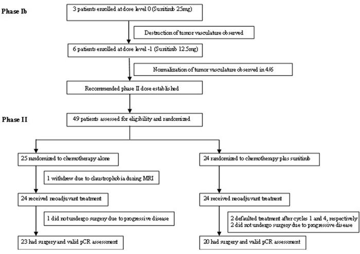 In the open-label phase II study, patients were randomized 1:1 to either four cycles of doxorubicin/cyclophosphamide at the above-mentioned doses, or the same chemotherapy plus sunitinib at the recommended phase II dose. The study schema is shown in Supplementary Figure S3. Primary prophylactic colony stimulating factor was disallowed. Primary endpoint was pCR rate, defined as the absence of all invasive cancer in the breast and axillary lymph nodes at the time of surgery [19]. Secondary endpoints were i) objective clinical response rates (complete plus partial) using RECIST v1.0 criteria, ii) axillary lymph node down-staging (conversion of clinically-involved lymph nodes to histologically-negative nodes at the time of surgery), iii) rates of breast conserving surgery, iv) safety and tolerability, and v) correlation of pharmacodynamic biomarkers [IHC and dynamic contrast enhanced (DCE)-MRI] with clinical outcomes. Uni-dimensional tumor measurements for clinical response assessment were obtained after each cycle of chemotherapy; hematologic parameters were obtained at the start and nadir of each chemotherapy cycle. Patients were evaluated for surgery upon completion of four cycles of chemotherapy or at the time of clinical tumor progression, whichever occurred first. Post-operative therapy was in accordance to institutional guidelines. Relapse and survival follow-up was performed at 3–6 monthly intervals. All participants provided written informed consent and the institutional ethics committee approved the study protocol (ClinicalTrials.gov NCT01176799).