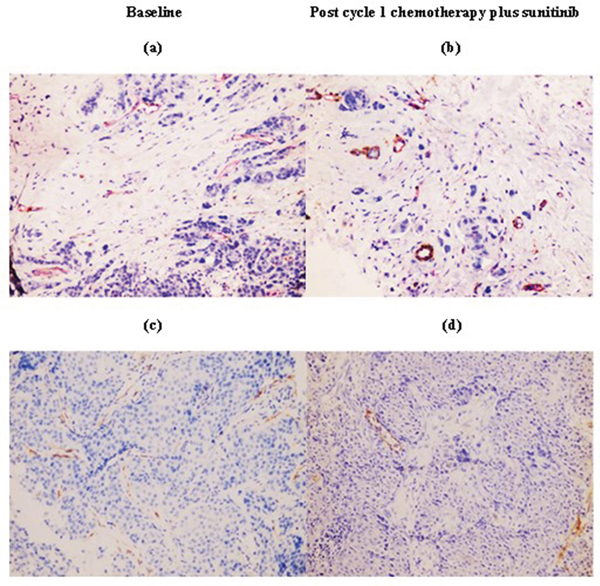 Our decision to de-escalate the dose of sunitinib from 25 mg to 12.5 mg in the phase Ib study was based on just one patient’s post-sunitinib tumor biopsy because the post-sunitinib biopsy samples of the other two patients enrolled in the same cohort were inadequate for analysis. Conclusions may have been more robust if we had enrolled more patients in each dose cohort or replaced patients with inadequate biopsy samples. However, this particular biopsy clearly demonstrated tumor vessel destruction, and according to our dose-escalation guidelines, this warranted enrolling subsequent patients at the next lower dose level. Furthermore, all three patients at this dose level developed febrile neutropenia, suggesting that the 25 mg dose level was not tolerable and enrolling further patients into the cohort would not have been justifiable. The next lower dose level of 12.5 mg met the histological criteria for evidence of vascular normalization in four out of six patients, and was also found to be tolerable with standard doses of chemotherapy in our dose-finding study. Since our goal was to find the lowest dose of sunitinib that could normalize tumor vasculature, we established sunitinib 12.5 mg for 7 days as the recommended phase II dose. Whether an even shorter duration of sunitinib treatment would achieve similar pharmacodynamic effects remains an interesting question, which is best addressed through a separate study.
