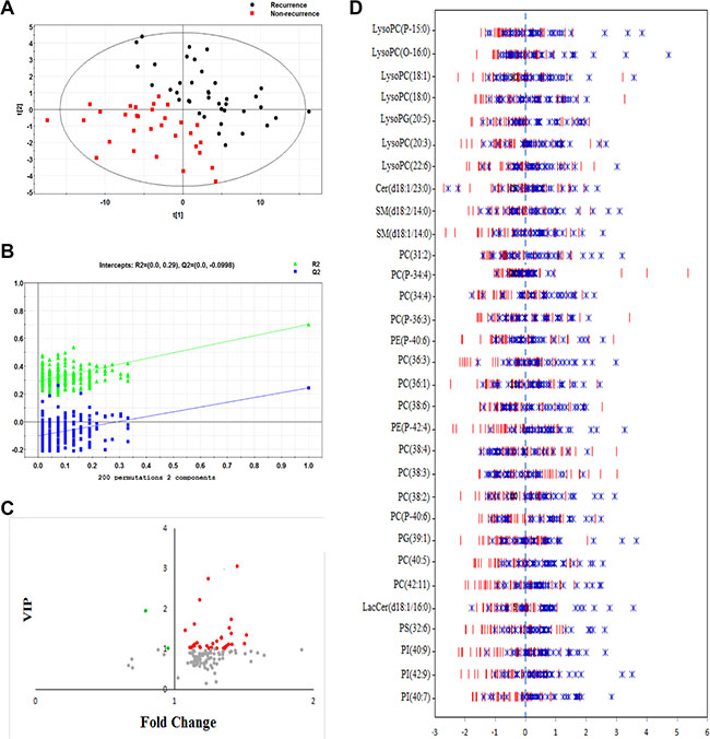 Kruskal–Wallis rank sum test was used to determine the significance of each lipid (P < 0.05). Principal component analysis (PCA) was first used to detect stability and replication. Partial least squares discriminant analysis (PLS-DA) with mean centering and unit variance scaling of significant metabolites were carried out to understand global lipid changes between with and without EOC recurrence groups, as well as between ER and LR, NR. The parameters of the model, such as R2Y and Q2 were used to evaluate the over-fitting of model based on 7-fold cross-validation. The variable importance in the projection (VIP) values, calculated based on the established PLS-DA models with thresholds of 1.0, were used for the selection of potential biomarkers. Random forest model was used to evaluate predictive performance of potential biomarkers based on leave-one-out cross-validation in terms of area under the receiver operating characteristic (ROC). In terms of clinical applicability, we selected the lipid with strongest prediction performance that would be complementary to demographic and clinical predictors. The predictive accuracy of demographic and clinical predictors alone and with the predictive lipids was performed using the logistic regression modeling with AUC value. For both the potential lipid biomarkers and the clinical predictors, 2 models are presented. Model 1 includes clinical characteristics. Model 2 adds individual lipid. Statistical analysis was performed in the R platform, with the exception of PLS-DA which was analyzed using SIMCA-P (version 11.5; Umetrics, Malmo, Sweden).