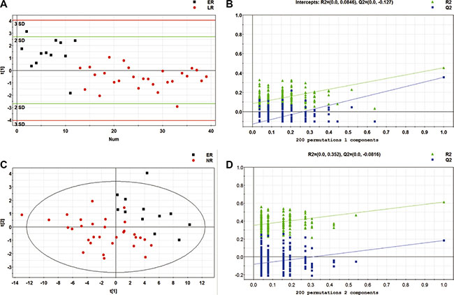 Figure 3: (A) PLS-DA score plot for discriminating early and late EOC recurrence; (B) Validation plot for discriminating early and late recurrent EOC patients with 200 permutations; (C) PLS-DA score plot for discriminating early and non-EOC recurrence; (D) Validation plot for discriminating early and non-EOC recurrence. ER: early recurrence; LR: late recurrence; NR: non-recurrence.