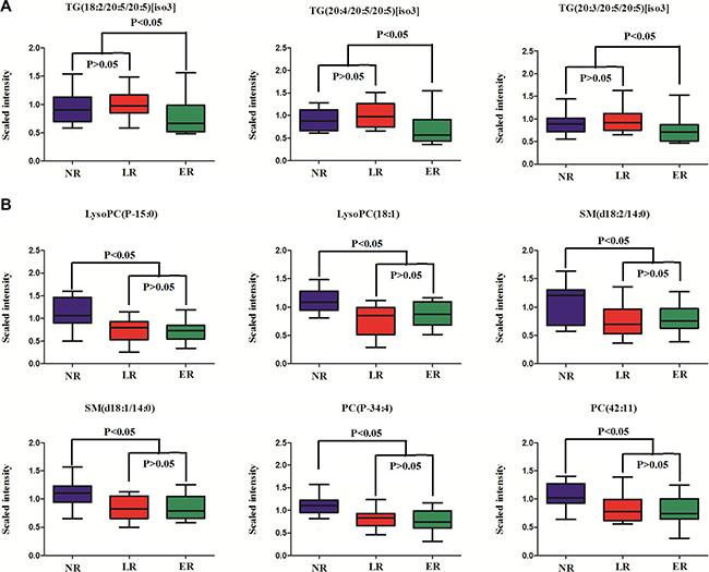 To further investigate the potential dynamics of the differential metabolites during EOC progression, we compared metabolite patterns of NR to LR and ER. In summary, there are two categories of metabolites. One represents significant alterations in early relapse compared to late relapse and non-recurrence, but no difference among late relapse and non-recurrence (Figure 4A). The other shows significant alterations in non-recurrence compared to early and late relapses, but no difference among early and late relapses (Figure 4B). Unfortunately, we found that no metabolite had significant alterations among early relapse, late relapse and non-relapse. Remarkably, three triglycerides (TGs) were dysregulated in ER patients, which deserves our attentions. Unexpectedly, the plasma concentrations of many LysoPCs, phosphatidylcholine (PCs) and phosphatidylinositols (PIs) were up-regulated in LR patients in comparison to ER patients, whereas, they were remarkably low in non-EOC patients.