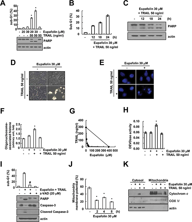 Because eupafolin has anti-tumor activity in several cancer cells [3, 4], we investigated whether eupafolin could sensitize TRAIL-mediated apoptosis in human renal carcinoma Caki cells. First, Caki cells were treated with eupafolin alone (20, 30 μM), TRAIL alone (50 ng/mL), and combined treatment with eupafolin and TRAIL. Apoptosis was determined using flow cytometric and Western blotting. As shown in Figure 1A, combined treatment with eupafolin and TRAIL markedly induced accumulation of sub-G1 population and cleavage of PARP, whereas treatment with eupafolin alone and TRAIL alone had no effect on apoptosis. In addition, combined treatment with eupafolin and TRAIL also induced accumulation of sub-G1 population and cleavage of PARP in a time dependent manner (Figure 1B and 1C). Combined treatment with eupafolin and TRAIL also induced apoptotic characteristics such as apoptotic body formation, cell shrinkage, and cell detachment on the plate (Figure 1D). Next, we analyzed nuclear condensation and DNA fragmentation, which is the hallmark of apoptosis. Eupafolin plus TRAIL-induced the DNA fragmentation and the nuclear condensation (Figure 1E and 1F). Moreover, combined treatment with various concentrations of eupafolin and TRAIL showed synergistic effects (Figure 1G). Next, we examined whether caspase activation plays a critical role in eupafolin plus TRAIL-induced apoptosis. Eupafolin plus TRAIL increased caspase-3 activity (Figure 1H), but not caspase-2, -8 and -9 (Supplementary Figure S1). The activation of caspase-3, accumulation of sub-G1 population and cleavage of PARP were completely prevented by pre-treatment with the pan-caspase inhibitor, z-VAD-fmk (Figure 1I). It has been known that the loss of mitochondria membrane potential (MMP) plays a critical role in apoptosis by releasing cytochrome c into the cytoplasm [15]. Therefore, we examined whether the loss of MMP is involved in eupafolin plus TRAIL-induced apoptosis, by using rhodamine123 fluorescence dye. As shown in Figure 1J, eupafolin markedly reduced MMP levels, and increased cytosolic cytochrome c release in combined treatment with eupafolin and TRAIL (Figure 1K). These results suggest that combined treatment with eupafolin and TRAIL can induce caspase-dependent apoptosis in Caki cells.