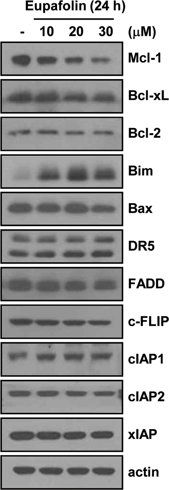 Figure 2: Effects of eupafolin on expression levels of apoptosis-related proteins. Caki cells were treated with the indicated concentrations of eupafolin for 24 h. The protein levels of Mcl-1, Bcl-xL, Bcl-2, Bim, Bax, DR5, FADD, c-FLIP, cIAP1, cIAP2, XIAP, and actin were determined by Western blotting. The level of actin was used as a loading control.