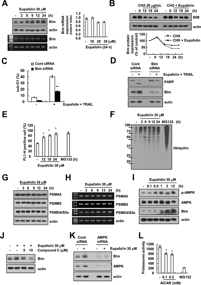 Figure 4: Eupafolin induces up-regulation of Bim expression through AMPK-mediated inhibition of proteasome activity. A. Caki cells were treated with 30 μM eupafolin for the indicated time periods. The protein and mRNA levels of Bim were determined by Western blotting, RT-PCR and real-time PCR, respectively. The level of actin was used as a loading control. B. Caki cells were treated with 30 μM eupafolin for 12 h, and then cells were washed with PBS. Caki cells treated with 20 μg/mL CHX in the presence or absence of 30 μM eupafolin for the indicated time points. The protein levels of Bim and actin were determined by Western blotting. The level of actin was used as a loading control. The band intensity of the Bim protein was measured using ImageJ (public domain JAVA image-processing program; http://rsb.info.nih.gov/ij, lower panel). C and D. Caki cells were transiently transfected with Bim siRNA or control siRNA. Overnight after transfection, cells were treated with 30 μM eupafolin and 50 ng/ml TRAIL for 24 h. The level of apoptosis was analyzed by measuring the sub-G1 fraction by flow cytometry. The protein levels of PARP, Bim, and actin were determined by Western blotting. The level of actin was used as a loading control. E. Caki/ZsGreen cells were treated with 1 μM MG132 (as a positive control) and indicated concentrations of eupafolin for 24 h. Proteasome activity was analyzed by using FACS analysis. F. Caki cells were treated with 30 μM eupafolin for the indicated time periods (MG132: positive control). The protein levels of ubiquitin were determined by Western blotting. G and H. Caki cells were treated with 30 μM eupafolin for the indicated time periods. The protein levels of PSMA5, PSMB5, PSMD4/S5a, and actin were determined by Western blotting (G) and RT-PCR (H), respectively. The level of actin was used as a loading control. I. Caki cells were treated with the 30 μM eupafolin for the indicated time periods. The protein levels of phospho(p)-AMPK, AMPK, Bim, and actin were determined by Western blotting. The level of actin was used as a loading control. J. Caki cells were pretreated with the indicated concentrations with compound C for 30 min, and then added 30 μM eupaforin for 24 h. The protein levels of Bim and actin were determined by Western blotting. The level of actin was used as a loading control. K. Caki cells were transiently transfected with AMPK siRNA or control siRNA. Overnight after transfection, cells were treated with 30 μM eupafolin for 24 h. The protein levels of Bim, AMPK and actin were determined by Western blotting. The level of actin was used as a loading control. L. Caki cells were treated with 1 μM MG132 (as a positive control) and indicated concentrations of AICAR for 24 h. The cells were lysed, and the proteasome activity was measured as described in the Materials and Methods. The values in panel (C, E and L) represent the mean ± SD from three independent samples. ** p < 0.05 compared to eupafolin plus TRAIL-treated control siRNA. * p < 0.05 compared to the control.