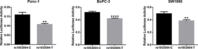 Figure 1: Dual luciferase reporter gene assays: the effects of rs1053004 on gene expression. The figure showed that compared to the construct with rs1053004-T, the construct with rs1053004-C had significantly higher luciferase activity in three PC cell lines. Unpaired Student’s t-test was used to evaluate the differences and p values less than 0.05 was considered significant with ** indicating p < 0.01 and **** indicating p < 0.001.