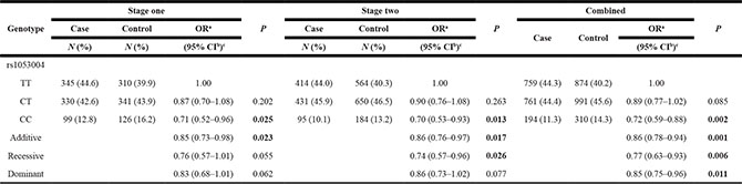 Both of the two SNPs (rs1053004 and rs1053005) were successfully genotyped. The call rates in both stages were > 95%, and the genotypes in controls conformed to HWE (P > 0.05). In stage one, only rs1053004 T > C polymorphism was found to be significantly associated with a decreased PC risk (CC versus TT: odds ratio (OR) (95% confidence interval (CI)) = 0.71 (0.52–0.96); P = 0.025). While no significant association was found between genotypes of rs1053005 and PC risk (CC versus TT: OR (95% CI) = 0.80 (0.57–1.11); P = 0.176). Rs1053004 was further replicated in stage two (CC versus TT: OR (95% CI) = 0.70 (0.53–0.93); P = 0.013). Consistently, individuals carrying rs1053004 CC genotype had lower risk of PC compared with the TT genotype (OR (95% CI) = 0.72 (0.59–0.88); P = 0.002) in the combined samples. And rs1053004 also showed to be significantly associated with PC risk in additive model in both two stages (OR (95% CI) stage one = 0.85 (0.73–0.98); OR (95% CI) stage two = 0.86 (0.76–0.97)) and combined samples (OR (95% CI) combined = 0.86 (0.78–0.94)). Two other models (dominant, recessive models) were also demonstrated in combined samples. The genotype frequencies and detailed statistical results of rs1053004 and rs1053005 are summarized in Table 2 and Supplementary Table S1, respectively. Also, results of stratified analysis of association between rs1053004 and risk of PC by gender was presented in Supplementary Table S2.