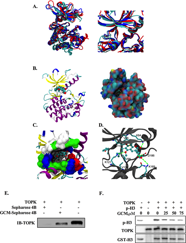 Figure 4: TOPK is a direct target of GCM. A. Three predicted structures of the full-length TOPK (left) and their ATP-binding sites (right). B. The docking model of GCM / TOPK complex structure. GCM is shown in sphere representation (carbons are colored by cyan. TOPK is shown as a cartoon model, left) and in surface representation of TOPK (the location of GCM is shown in ball-stick, right). C. Binding site of TOPK with GCM. The ATP-binding site of TOPK is shown in surface representation (white: hydrophobic residues, blue: residues with positive charge, red: residues with negative charge, green: other polar residues). GCM is shown in ball-stick representation. D. The detailed Interaction between TOPK and GCM. Carbons on TOPK are colored grey. GCM is shown in ball-stick representation and key residues on TOPK are shown in stick representation. Carbons, oxygen, nitrogen and sulfur atoms are colored cyan, red, blue and yellow respectively. E. GCM binds directly to TOPK. Sepharose 4B was used for binding and pull-down assay. Lane 1, the negative control, indicating no binding between TOPK and beads alone; Lane 2, TOPK binds to GCM-Sepharose 4B beads; lane 3, input control. F. GCM inhibited TOPK activity in vitro in a dose dependent manner. An inactive GST-Histine H3 protein was used as the substrate with active TOPK and the p-histone H3 was measured by western blotting.