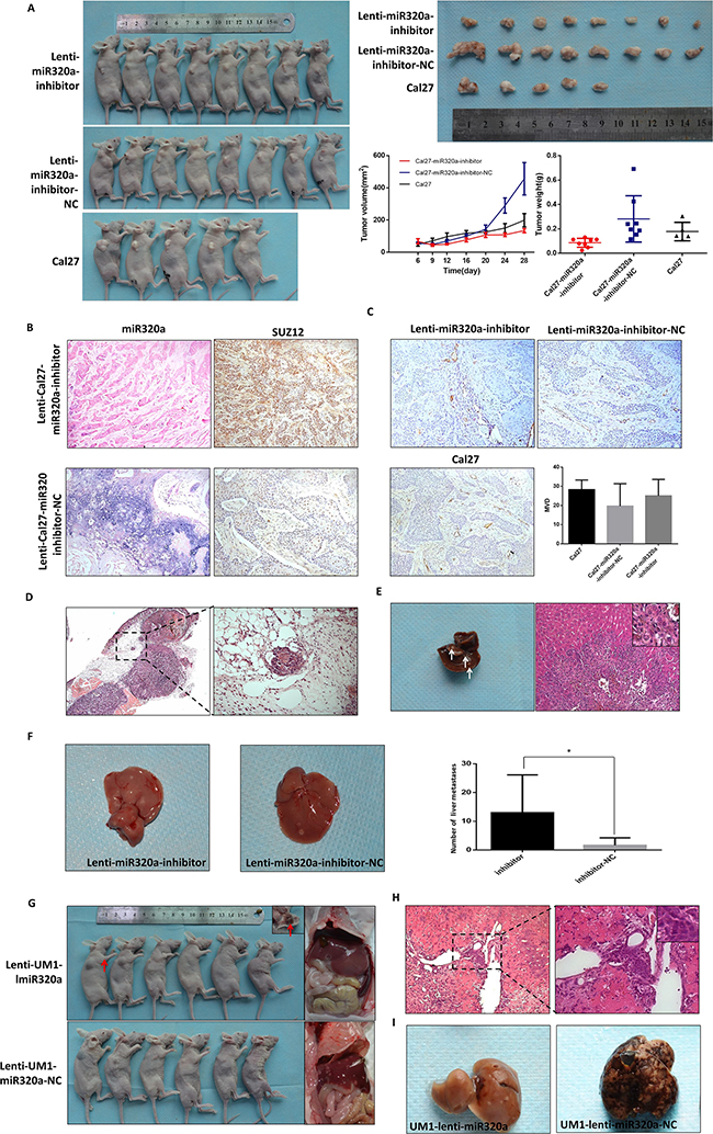 Figure 3: miR-320a suppresses invasion and metastasis of TSCC in vivo. A. The tumor xenografts of Cal27 in subcutaneously injected nude mice. B. The expression of miR-320a and SUZ12 in Cal27 tumor xenografts. C. The microvessels density (MVD) of Cal27 tumor xenografts labeled by CD31. D. Capsular invasion of the Cal27 tumor xenograft cells. E, The pathological characteristics of liver metastasis of Cal27 tumor xenografts. F. The number of liver metastasis lesion of lenti-Cal27-miR320a-inhibitor by tail vein injection. G. The liver metastasis of UM1 subcutaneous injection. Red arrows represent subcutaneous hematoma with fibrous capsule. H. The pathological characteristics of liver metastasis of UM1 subcutaneous injection. I. The liver metastasis of UM1-miR320a and UM1-miR320a NC cells by tail vein injection. *P<0.05.
