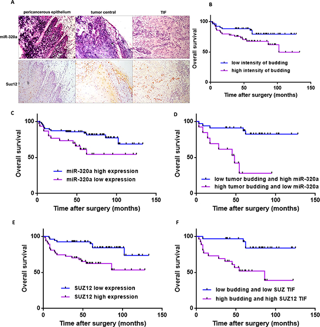 Figure 4: Cumulative overall survival curves after surgery in TSCC patients. A. The expression of miR-320a and Suz12 in pericancerous epithelium, the central tumor and the TIF in samples from one TSCC patient. Original magnification: 200×. B. Kaplan-Meier curves for the overall survival of patients with low-intensity (n=51) versus high-intensity (n=49) budding. C. Kaplan-Meier curves for the overall survival of patients with low expression of miR-320a (n=30) versus high expression (n=70). D. Kaplan-Meier curves for the overall survival of patients with low-intensity budding and high miR-320a (n=33) versus high-intensity budding and low miR-320a (n=13). E. Kaplan-Meier curves for the overall survival of patients with high Suz12 expression at the TIF (n=47) versus low expression (n=53). F. Kaplan-Meier curves for the overall survival of patients with low-intensity budding and low Suz12 (n=30) versus high-intensity budding and high Suz12 (n=26).