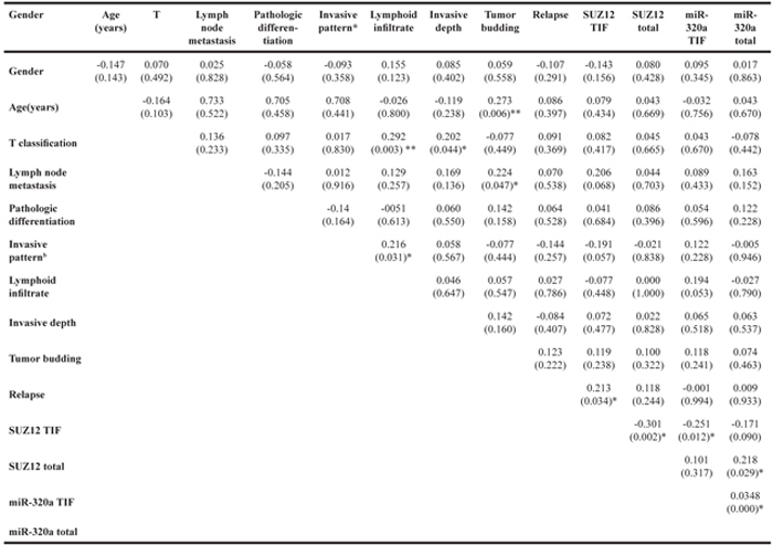 Correlations were tested among tumor budding, miR-320a, Suz12 and clinical parameters of the TSCC cases (Table 1). The results showed an association of lymphoid infiltrate with T classification (P<0.005) and invasive pattern (P<0.05). Invasive depth was related to T classification (P<0.05). As expected, correlations were also observed between the intensity of tumor budding and lymph node metastasis (P<0.01). Interestingly, a correlation between age and tumor budding was also observed (p<0.01). Suz12 was associated with tumor relapse (P<0.05). Consistent with the observed TSCC slices, Spearman’s correlation demonstrated that miR-320a and Suz12 were negatively correlated (P<0.05), especially at the TIF (P<0.05).