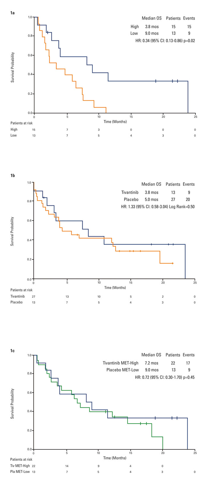 Figure 1: Kaplan-Meier analysis of overall survival by tumor MET. 1a. placebo patients by tumor MET status*. 1b. tivantinib versus placebo in MET-Low patients. 1c. placebo MET-Low versus tivantinib MET-High patients. *Figure reprinted and adapted from (Rimassa et al, Hepat Oncol 2014), with permission from Future Medicine.