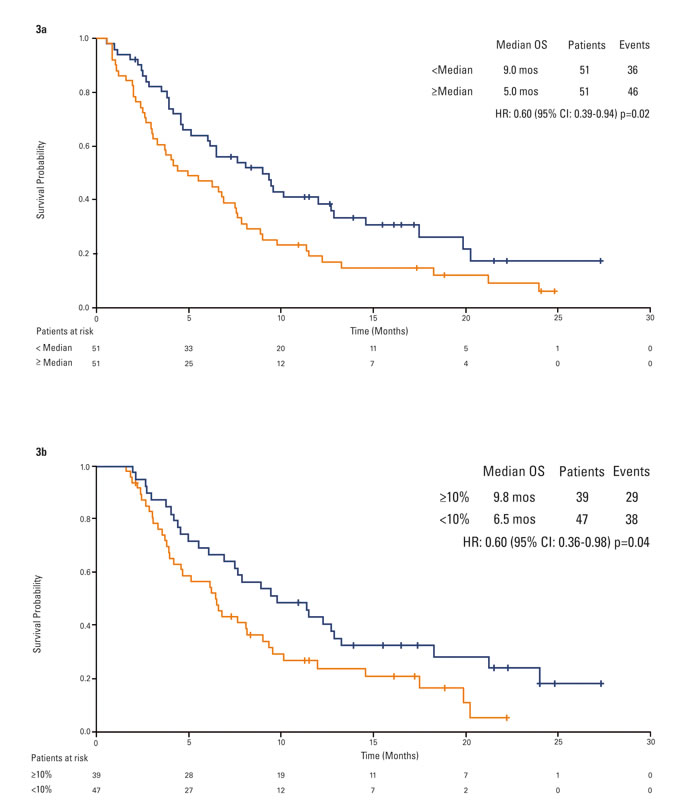 Figure 3: Kaplan-Meier analysis of overall survival by circulating HGF. 3a. overall population by baseline circulating HGF status. 3b. overall population by best change in circulating HGF.