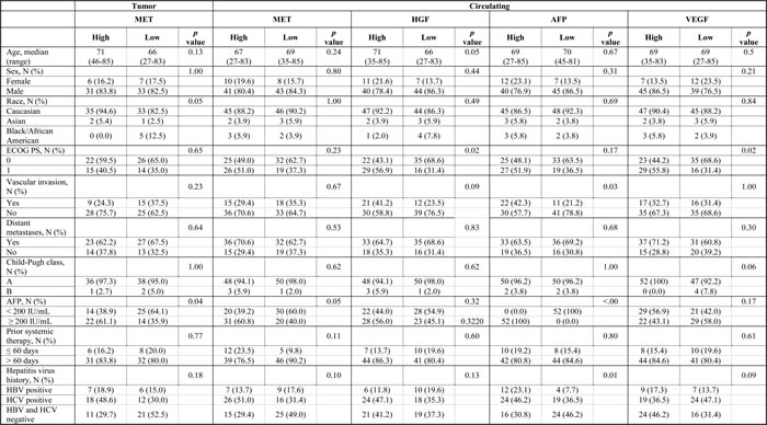 The test for interaction between treatment and MET status showed a statistical significance at an alpha level of 0.05 for OS (p = 0.04). Correlation between MET and other baseline characteristics was not detected except for a slight overlap between MET-High patients and patients with a baseline AFP higher than the median.