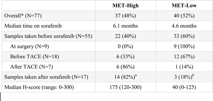 When distributing patients by H-score, the difference between MET-High and -Low patients was clear, with median H-score of 175 in MET-High and 40 in MET-Low patients. Approximately half the patients (48%) were found to be MET-High. Biopsy date was known for 72 samples. When samples were analyzed with respect to prior therapy, the chance of being MET-High was 40% if the biopsy was obtained before sorafenib (N = 55), and 82% if obtained after sorafenib (N = 17; Table 2).