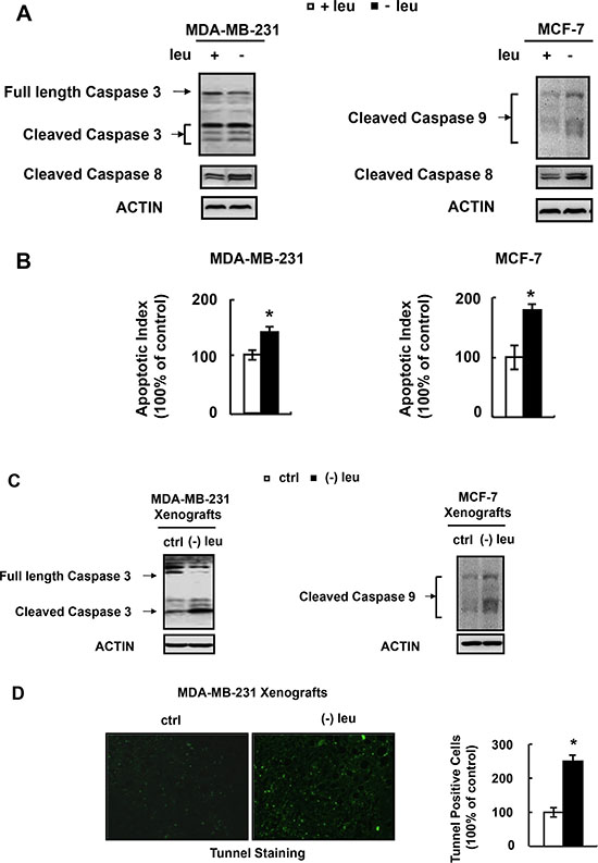 Figure 3: Leucine deprivation induces apoptosis of human breast cancer cell. (A and B) MDA-MB-231 or MCF-7 cells were incubated in control (+leu) or leucine-deficient (−leu) medium for 48h, followed by determination of cleaved caspases in A and annexin-V assay in B. (C and D) Nude mice bearing tumors were fed with control (ctrl) or (−) leu diet, for 4 days , followed by examination of cleaved caspases in C and in situ tunnel assay in D. Means ± SEMs shown are representative of at least three independent experiments in vitro or at least two independent in vivo. Statistical significance was calculated using the two-tailed Student t test for the effects of (−) leu vs. the control treatment (*p < 0.05).