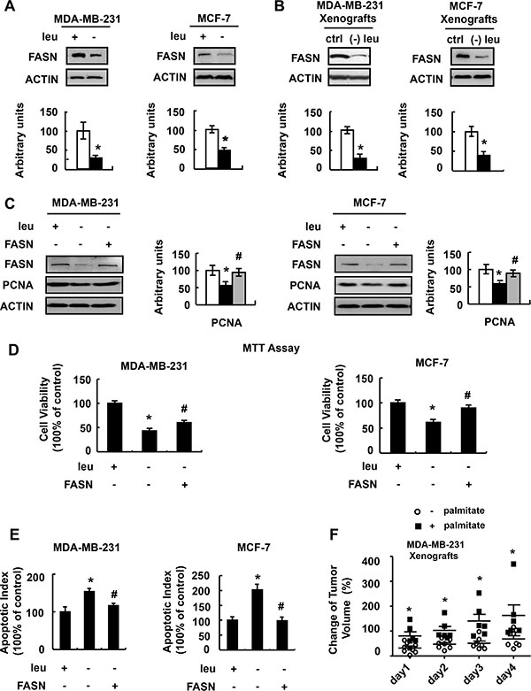 Figure 4: FASN mediates the effect of leucine deprivation on breast cancer cells. (A) MDA-MB-231 or MCF-7 cells were incubated in control (+leu) or leucine- deficient (−leu) medium for 48 h, followed by determination of FASN protein abundance. (B) Nude mice bearing tumors were fed a control (ctrl) or (−) leu diet for 4 days, followed by examination of FASN protein abundance. (C–E) FASN- over-expressing stable cells (+FASN) or control cells (−FASN) were incubated in control (+leu) or leucine-deficient (-leu) medium for 48 h, followed by determination of FASN expression in C, examination of cell viability in D and Annexin-V assay in E. (F) Nude mice bearing MDA-MB-231 tumor xenografts were orally supplemented with palmitic acid (+palmitate) or control solution (−palmitate) when fed with (−) leu diet, followed by measurement of the tumor volume at the indicated time point. Means ± SEMs shown are representative of at least three independent experiments in vitro or at least two independent in vivo. Statistical significance was calculated using the two-tailed Student t test for the effects of (−) leu vs. the control treatment (*p < 0.05) in A and B, with vs. without palmitic acid supplementation (*p < 0.05) in F, or using the one-way ANOVA followed by the Student- Newman-Keuls (SNK) test for the effects of (−) leu vs. the control treatment (*p < 0.05) in C–E, with or without FANS over-expression in (−) leu group (#p < 0.05) in C–E.