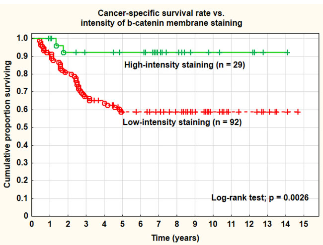 Figure 3: Cancer-specific survival rate vs. nuclear β-catenin staining.