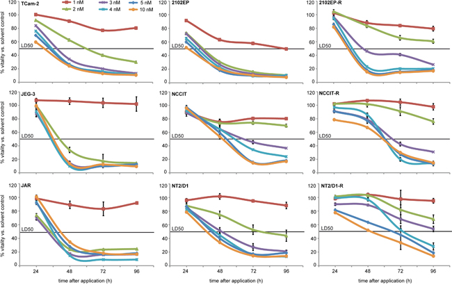 We utilized GCC cell lines and corresponding cisplatin-resistant subclones. The cell line TCam-2 was used as a proxy for a seminoma, while the three cell lines 2102EP, NCCIT and NT2/D1 were derived from ECs and the two cell lines JAR and JEG-3 resemble a choriocarcinoma in culture [10–14]. As controls we included human primary fibroblasts (MPAF, ARZ, EMF) and the Sertoli cell line (FS1) [15].